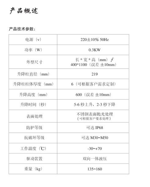 全自動(dòng)升降柱主要由全自動(dòng)升降柱體、氣缸、導(dǎo)向軸、封蓋、外箱、鎖等部分組成。升降體:采用304國(guó)標(biāo)不銹鋼8mm/6mm厚鋼管加工形成,具有高強(qiáng)度的承重和抗撞能力;柱體內(nèi)無(wú)電器、線路設(shè)置,防水、安全。